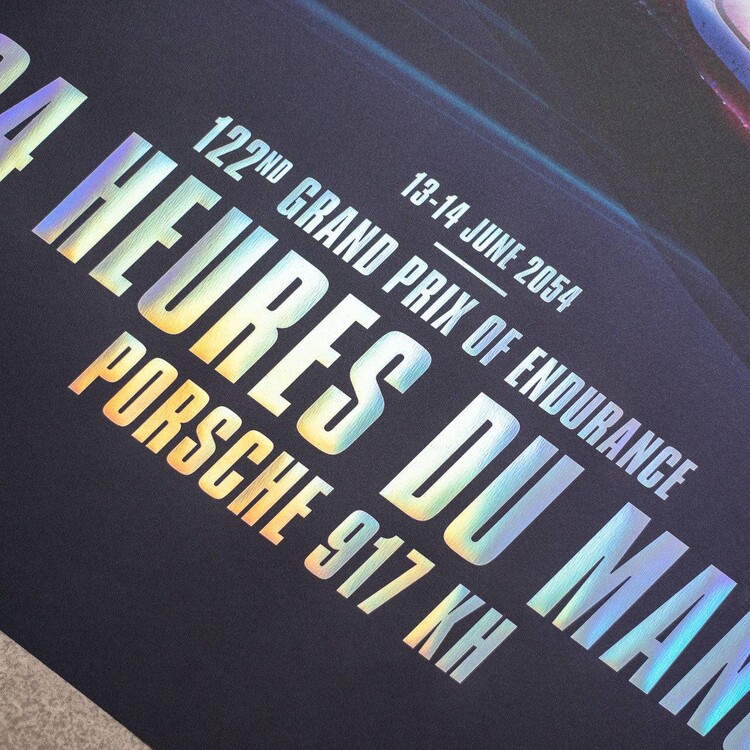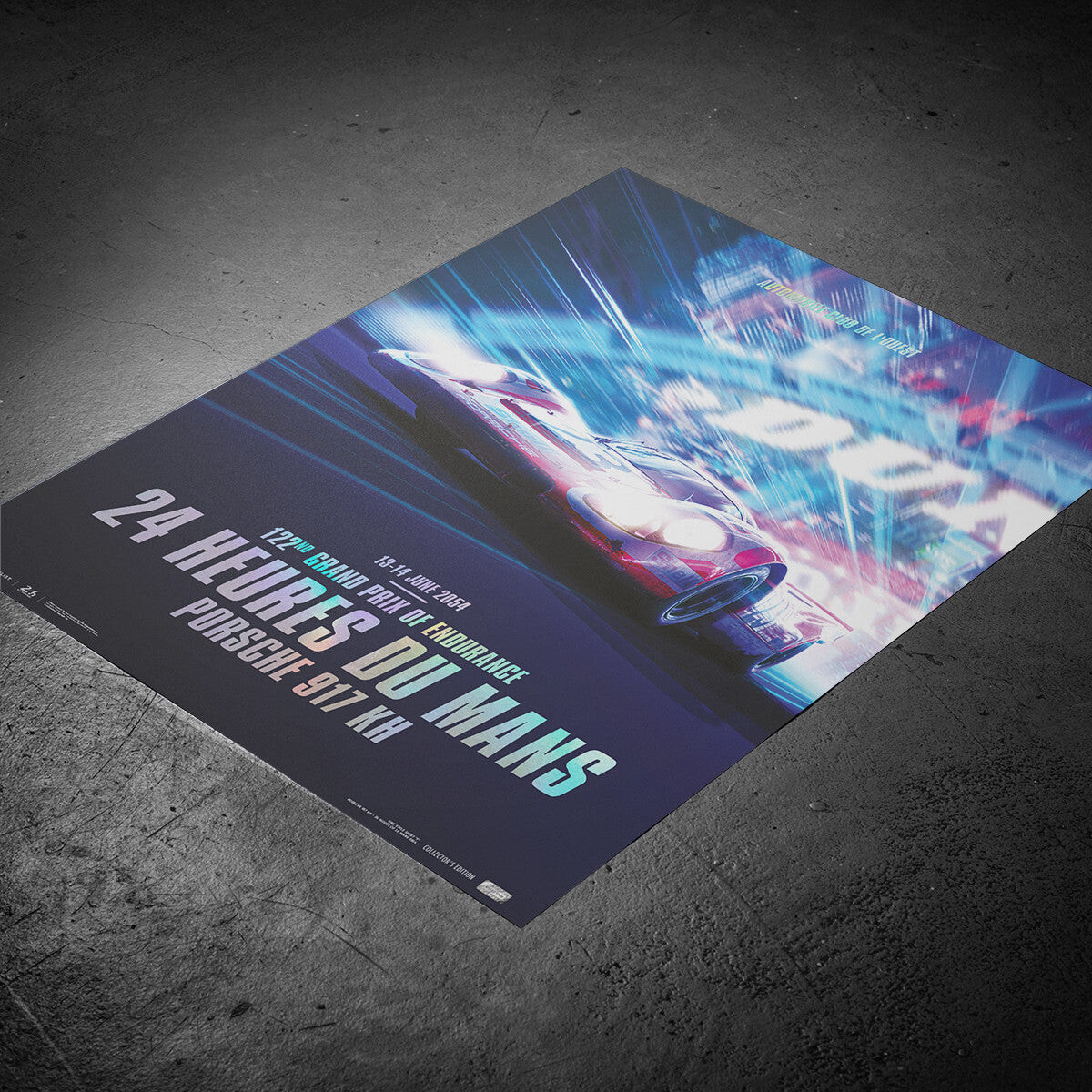 The Porsche 917 gave the brand its most glorious moments in Le Mans, that began with the victory in 1970 and went on to become 19 more wins for Porsche. That’s why we have taken this iconic car into the future, for a 24-hour competition a few decades ahead, in a dystopian future full of Urban hues and structures, the competitive nature remains the same, and the car livery remains the same - as a tribute to the win in 1970, where it all began. Automobilist is delighted to turn this vision into, if not reality exactly, then at least this stunning poster. But the Le Mans in 1970 is where it all began, with this tribute.