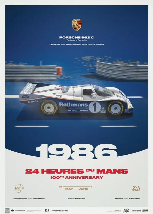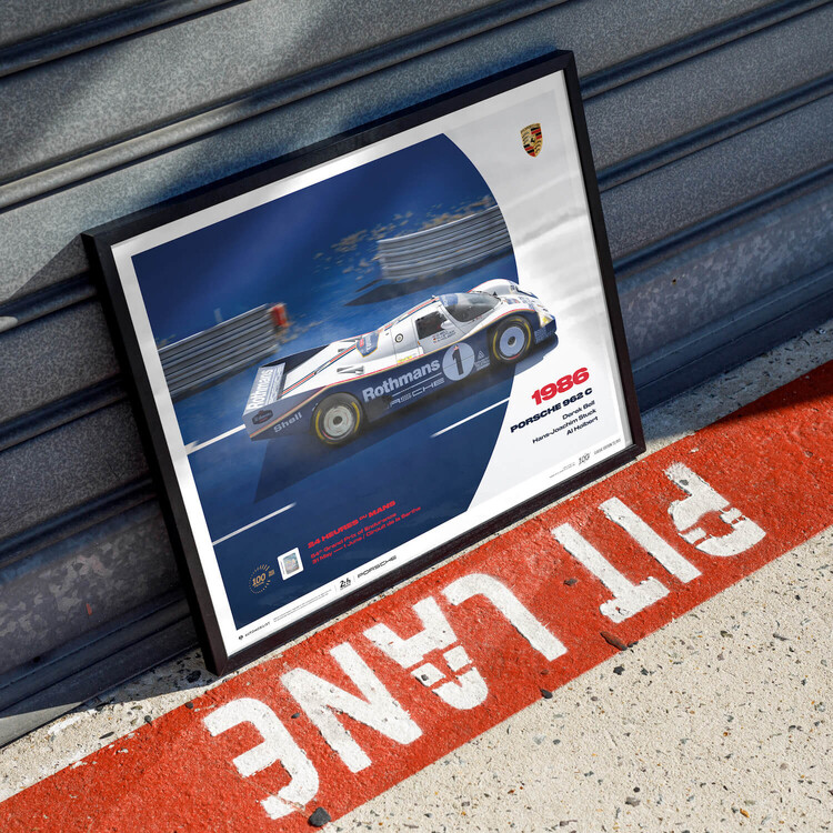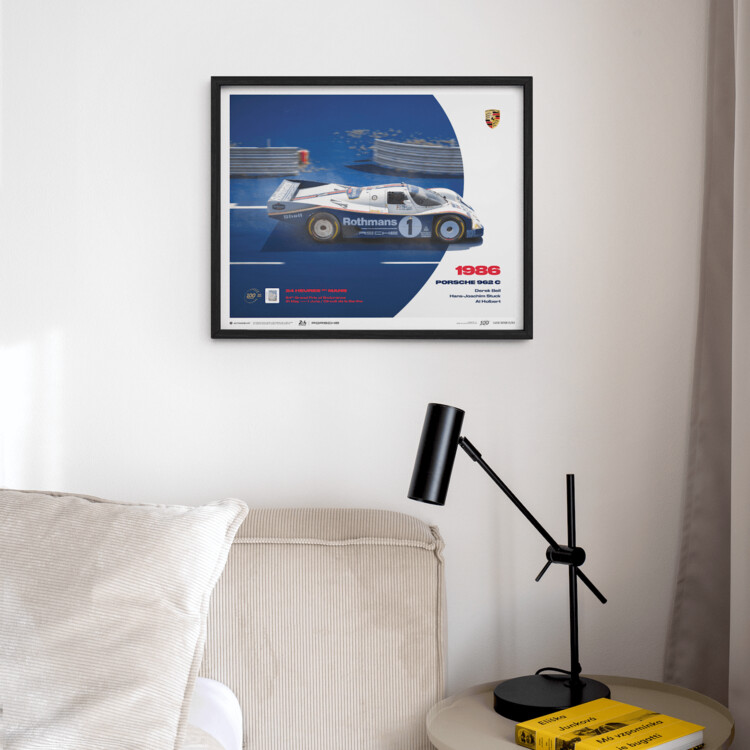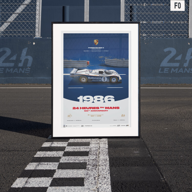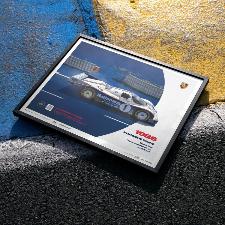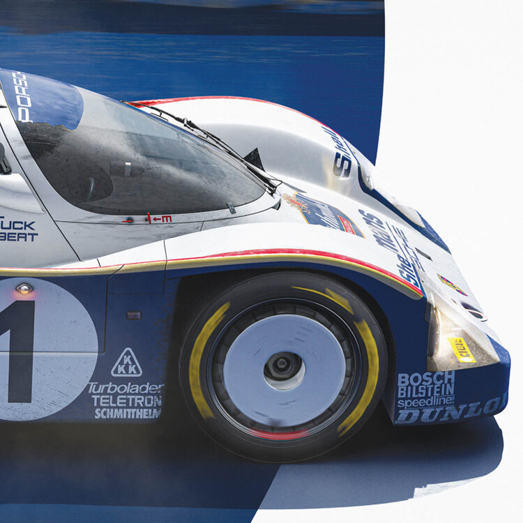 Not only was the 962 C a beast of a car, but it was also a thing of beauty. Equipped with the Type-935 2.6L Turbo Flat-6 engine producing a staggering 620 bhp (462 kW), the car was capable of top speeds a little shy of 350 km/h (217 mph). The blue and white Rothman's livery is also widely acknowledged as one of the prettiest of all time, cementing the car's legendary status. Our tribute poster to the Porsche 962 C captures the car's legendary design at high speeds around the Circuit de la Sarthe, making it a must-have for any endurance racing enthusiast.