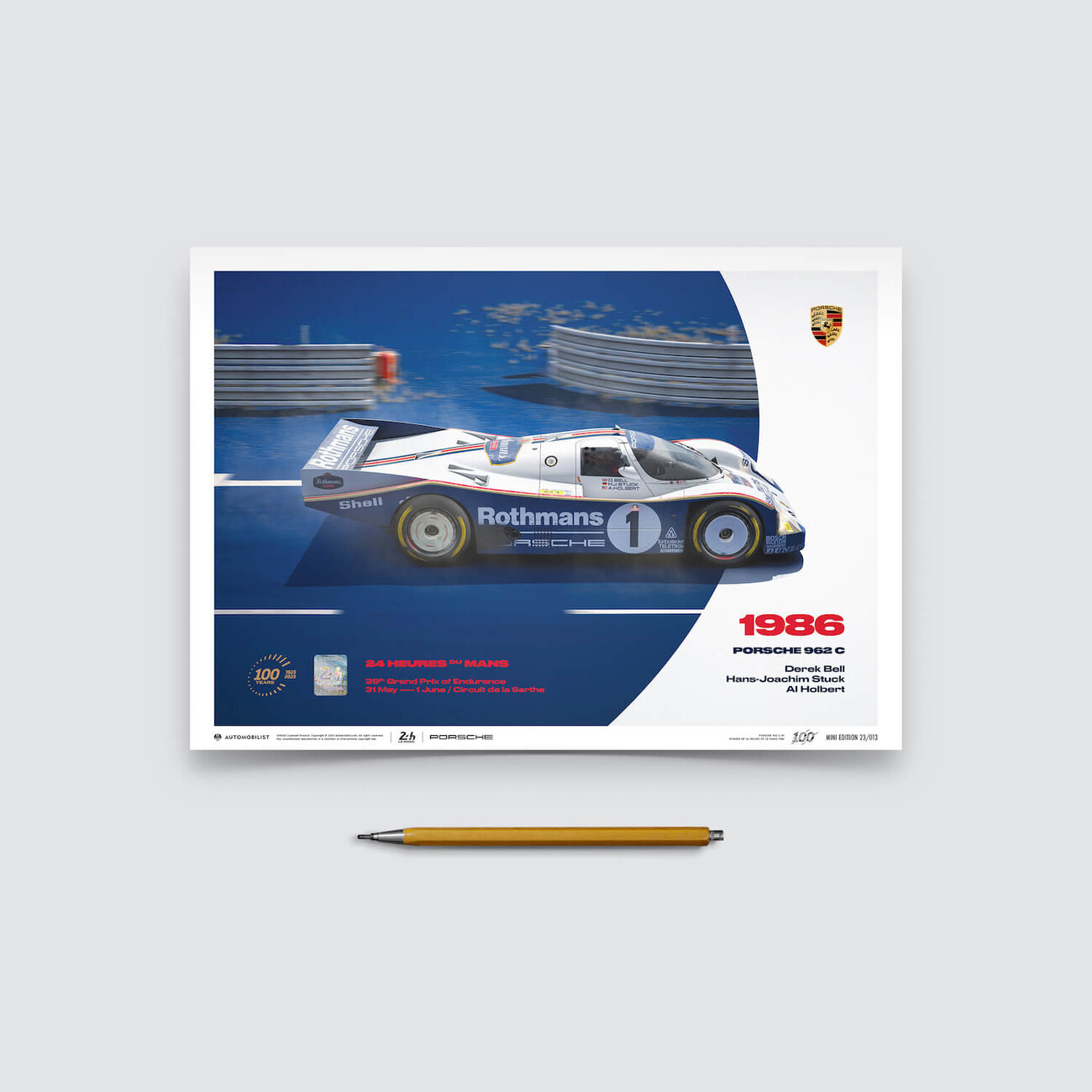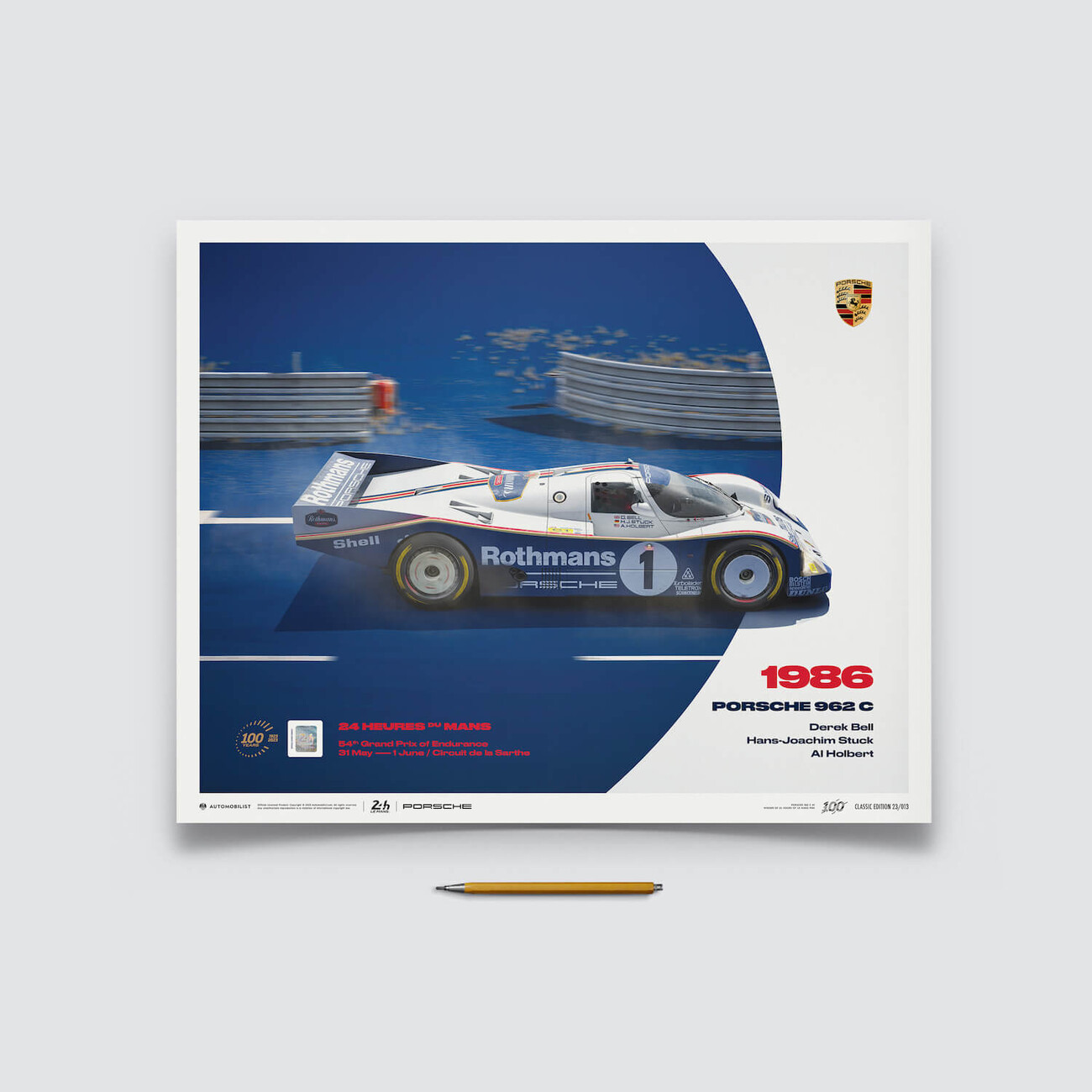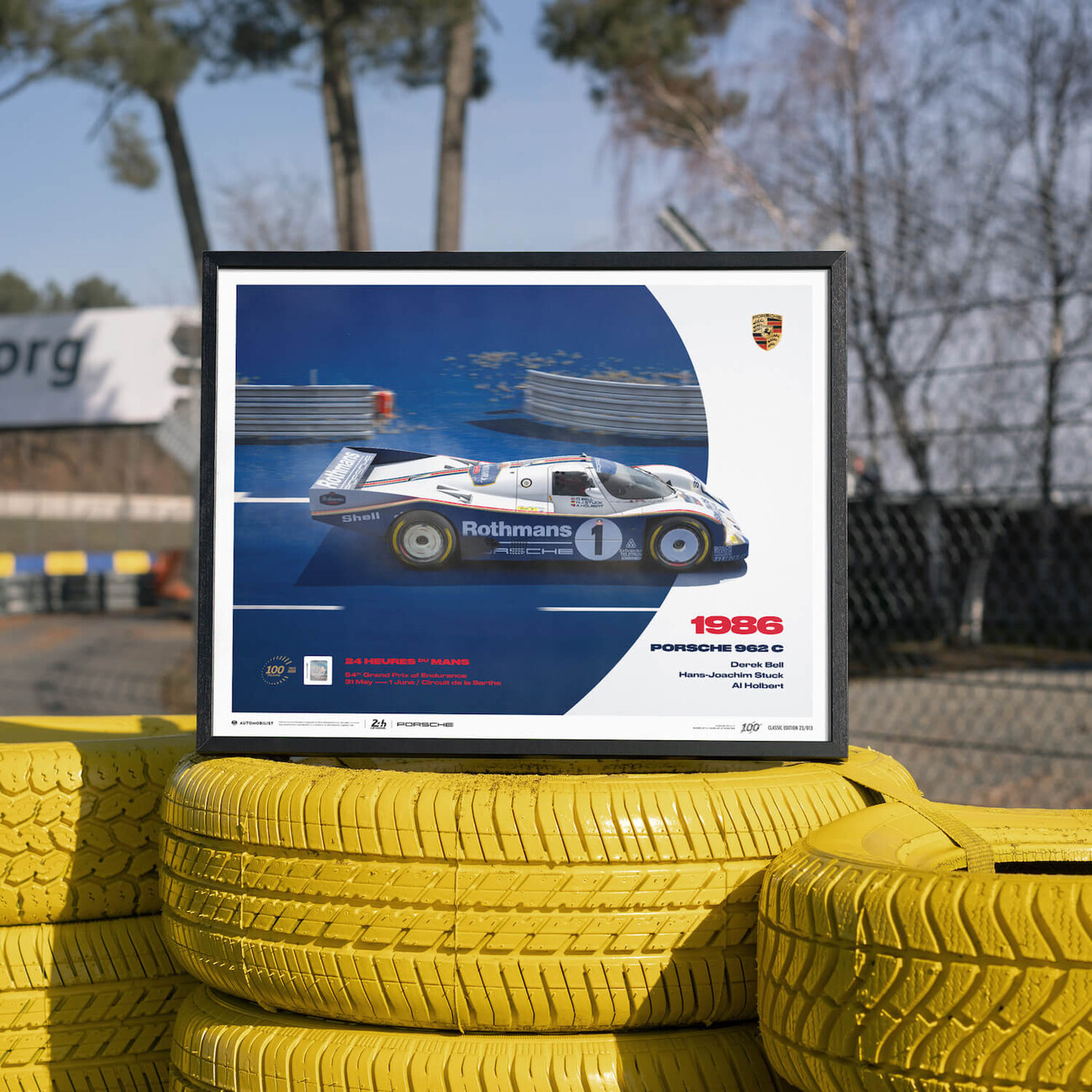 Not only was the 962 C a beast of a car, but it was also a thing of beauty. Equipped with the Type-935 2.6L Turbo Flat-6 engine producing a staggering 620 bhp (462 kW), the car was capable of top speeds a little shy of 350 km/h (217 mph). The blue and white Rothman's livery is also widely acknowledged as one of the prettiest of all time, cementing the car's legendary status. Our tribute poster to the Porsche 962 C captures the car's legendary design at high speeds around the Circuit de la Sarthe, making it a must-have for any endurance racing enthusiast.