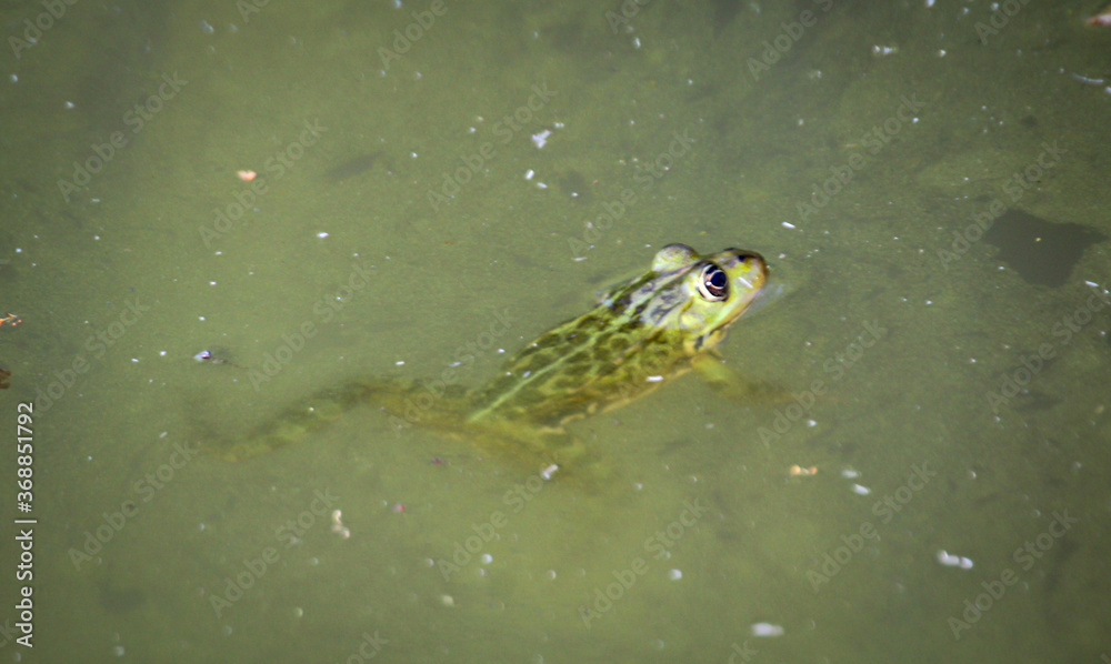 Obraz na plátně Portrait eines grünen Teichfrosch am Rand eines Gewässers.