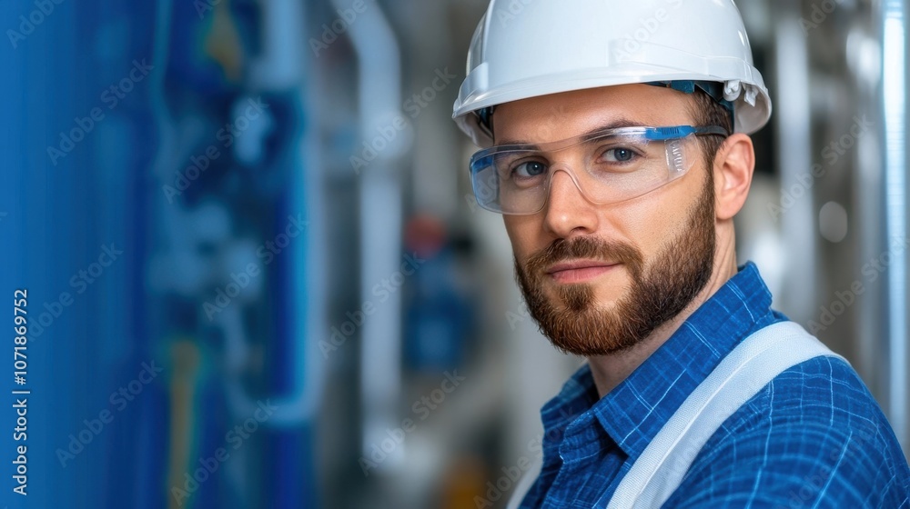 Fotografie Portrait of a bearded male construction worker wearing a hardhat and safety glas