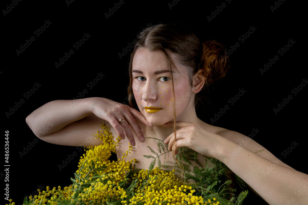 Obraz na plátně Portrait of a girl with mimosa close-up