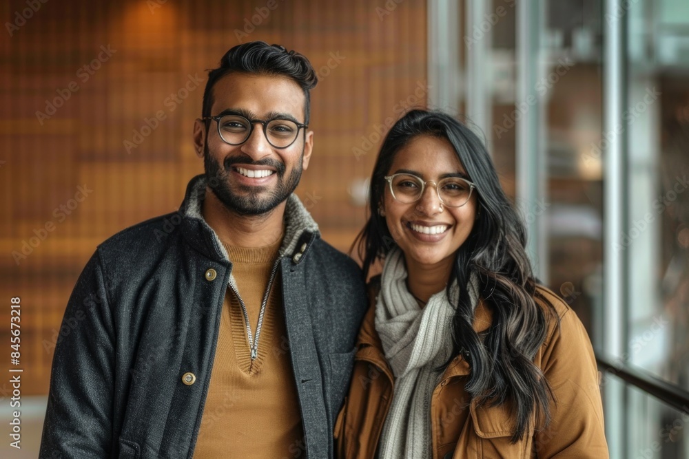 Fotografie Portrait of a smiling indian couple in their 30s wearing a lightweight packable
