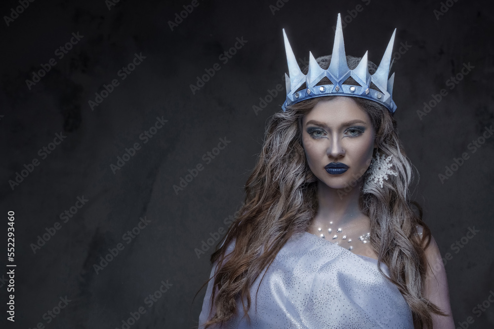 Fotografie Portrait of attractive ice queen with curly hairs and frozen skin staring at camera