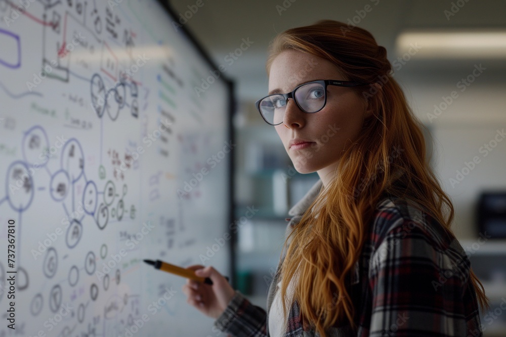 Fotografie Portrait of female mathematician standing by a whiteboard with a marker in hand, writing mathematical equations, formulas, calculations