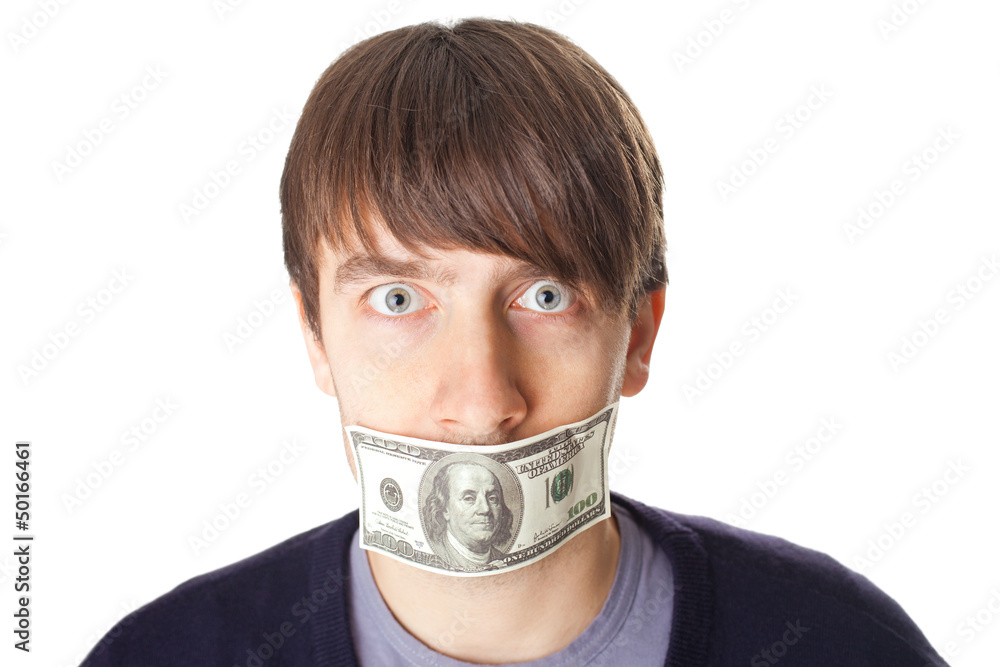 Obraz na plátně Portrait of young man with a 100 dollar banknote on his mouth is