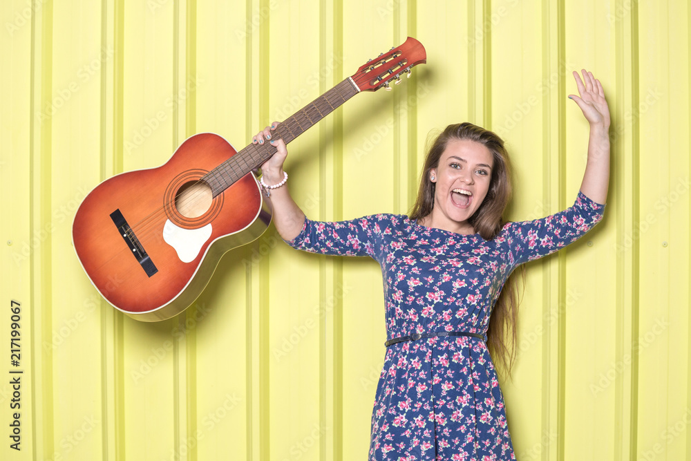 Fotografie Portrait of young woman with guitar isolated on yellow metal wall