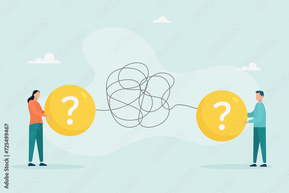 Fotografie Problems in communication concept, misunderstandings create confusion in work, unclear messages and information are conveyed incorrectly, businessman and woman have problems understanding each other