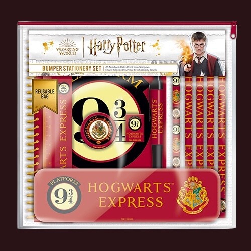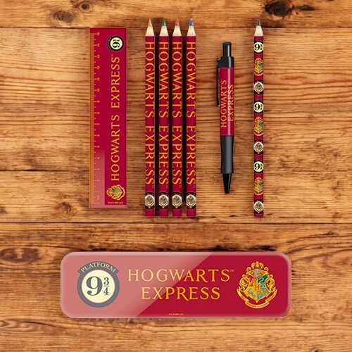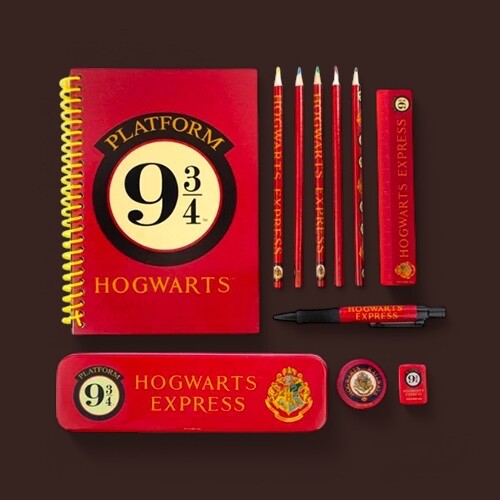 Stylová sada psacích potřeb ve stylu Harryho Pottera obsahuje zápisník s kroužkovou vazbou, penál, propisku, 4 barevné pastelky, tužku, pravítko, gumu a ořezávátko, vše zdobené grafikou ikonického Nástupiště 9 a 3/4.