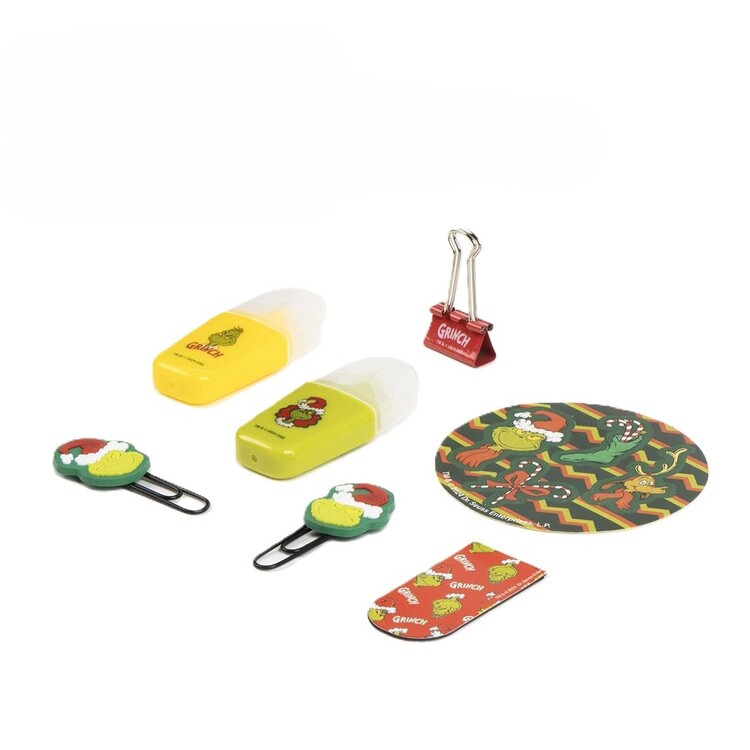 Papírenská sada s motivem Grinche uložená v průhledné vánoční kouli s mašlí k zavěšení na stromek. Uvnitř najdete 4 samolepky, 2 mini zvýrazňovače, 2 papírové klipy s gumovou ozdobou, 1 magnetickou záložku do knihy a 1 kovovou svorku (binder klip). Ideální pomocník do diáře i na pracovní stůl.