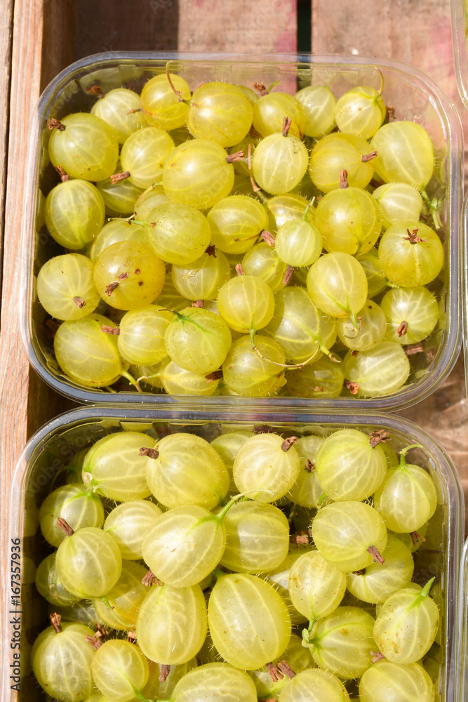 Fotografie Punnets of gooseberries for sale at greengrocers