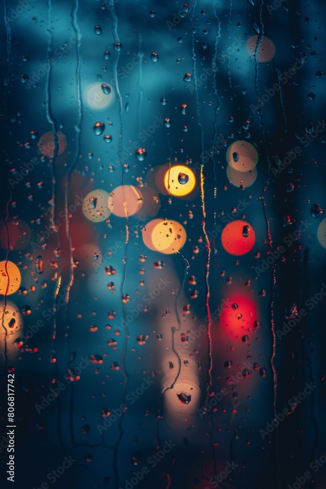 Fotografie Raindrops on window with blurred city lights in background
