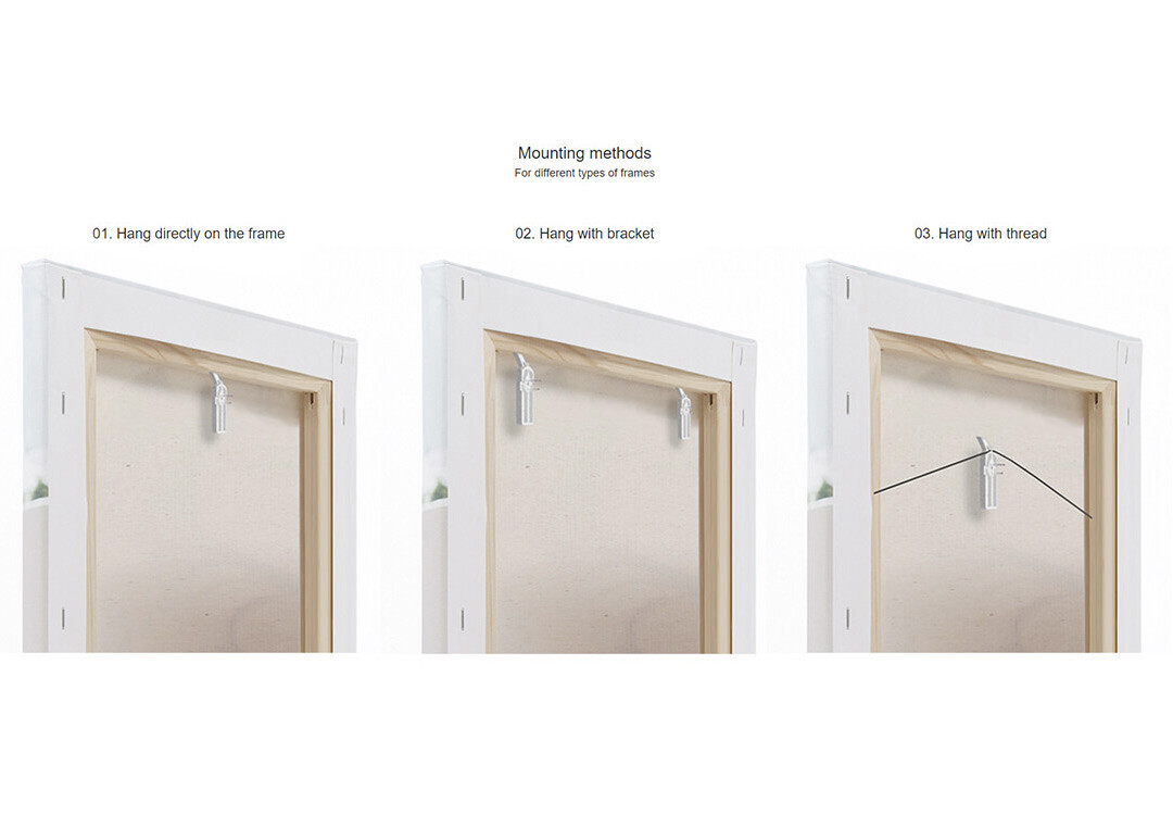 Balení obsahuje 2 plastové háčky o rozměrech 5,5 cm x 2,5 cm, za pomoci kterých jednoduše připevníte obraz na zeď. Snadno a rychle, bez potřeby šroubů, hmoždinek či vrtání!