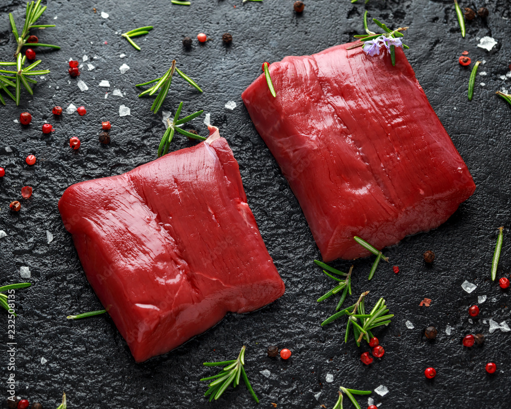 Fotografie Raw venison steak with rosemary and pepper on black rustic table.