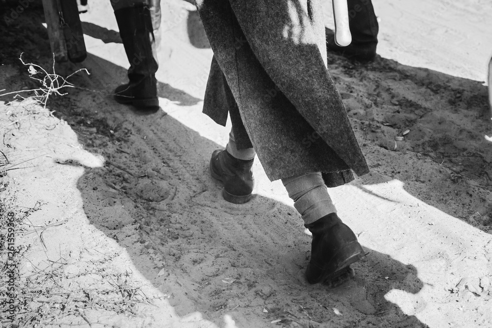 Obraz na plátně Re-enactors Dressed As World War II Russian Soviet Red Army Soldiers Goes Along Road