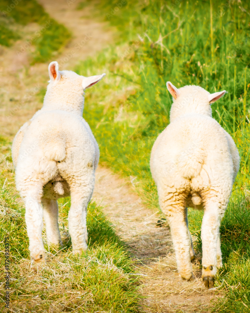 Fotografie Rear view of two young cute adorable lambs walking on countryside path represent