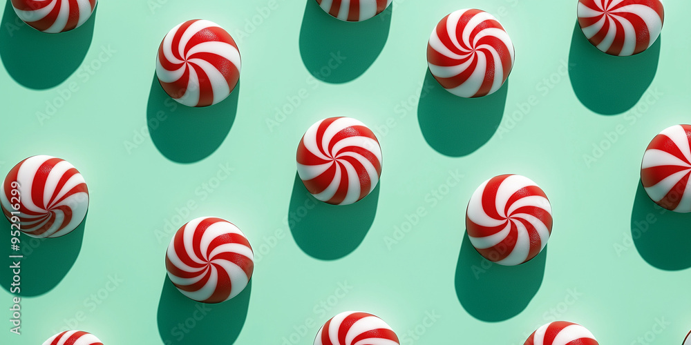 Fotografie red and white striped peppermint candies, each with a shadow, arranged randomly