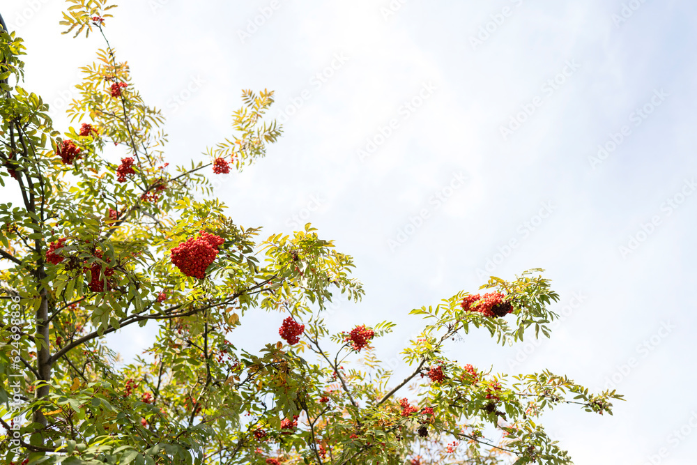 Fotografie Red rowan berries on the branches of a tree against the sky
