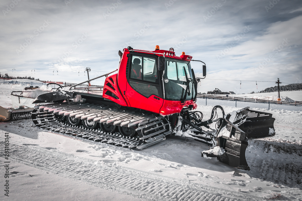Obraz na plátně Red snow-grooming machine on snow