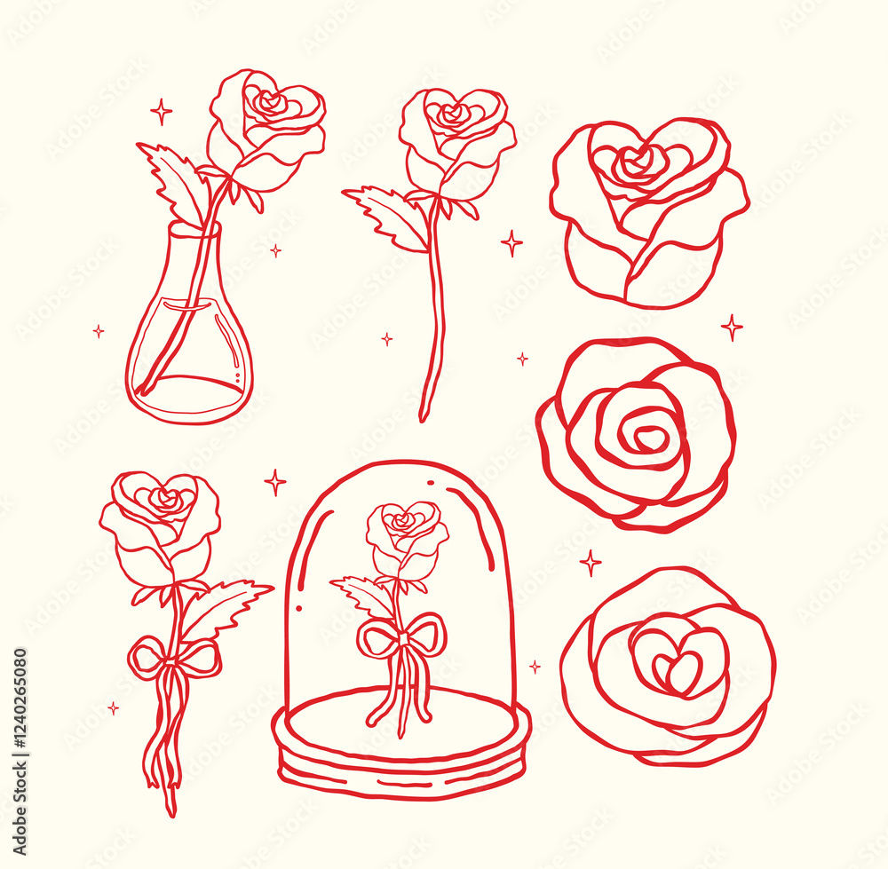Fotografie Retro Valentine Rose Set with Wavy Squiggle Outline in Hand Drawn Style