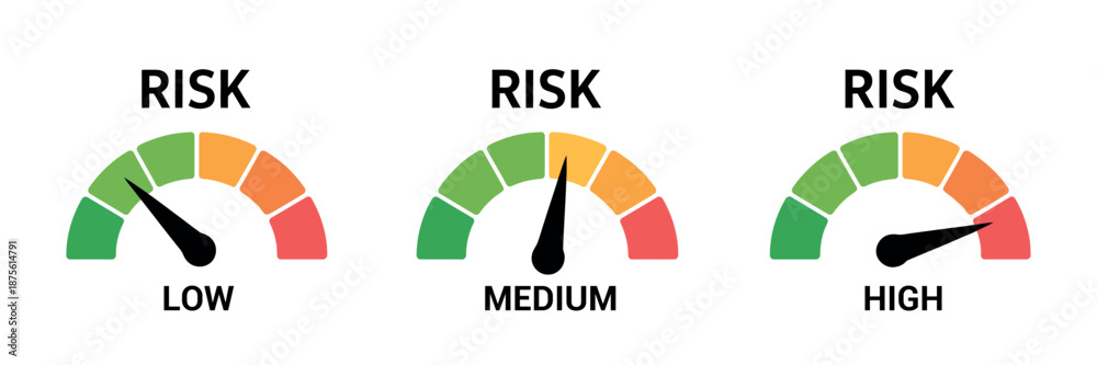 Fotografie Risk Meter icon set featuring low medium and high scale on speedometer gauges