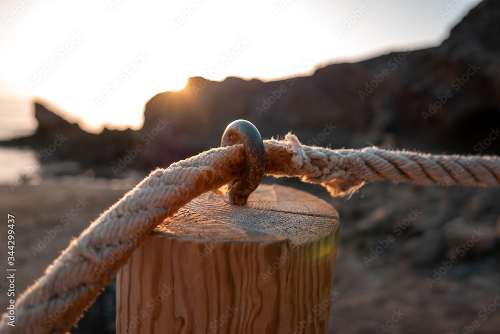 Fotografie Rope passing through wooden pole at seaside at sunset