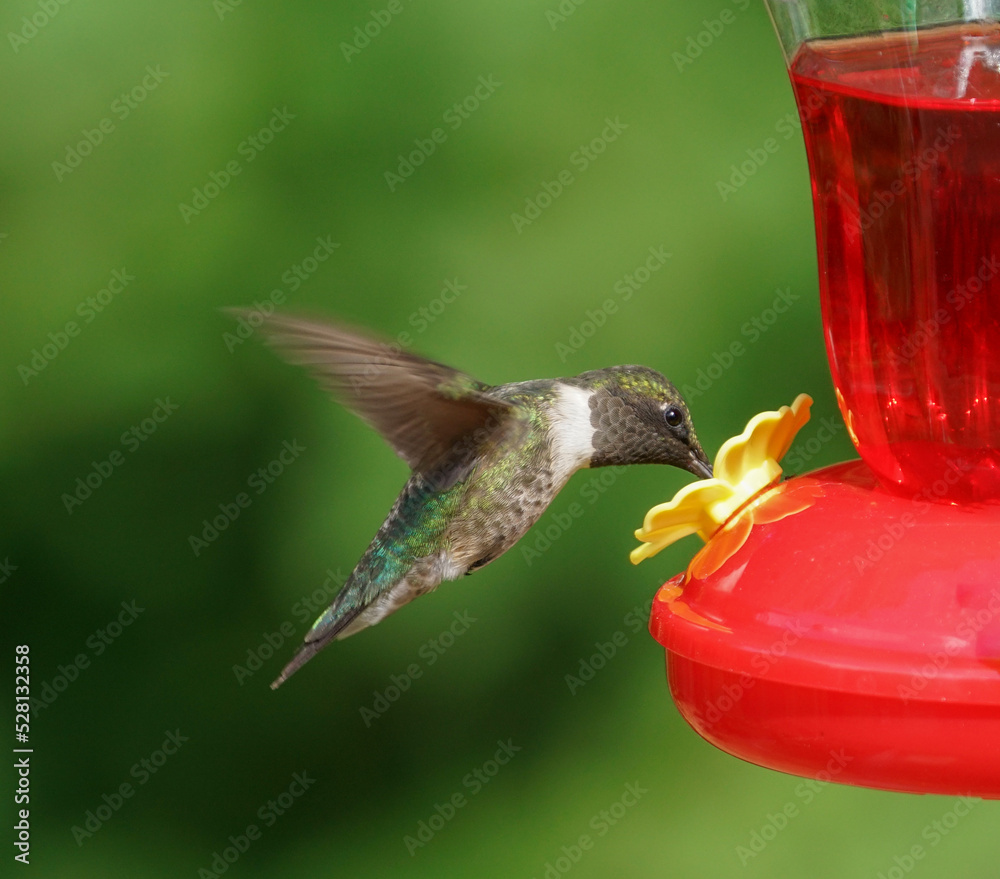 Fotografie ruby throat hummingbird flying on the nectar feeder
