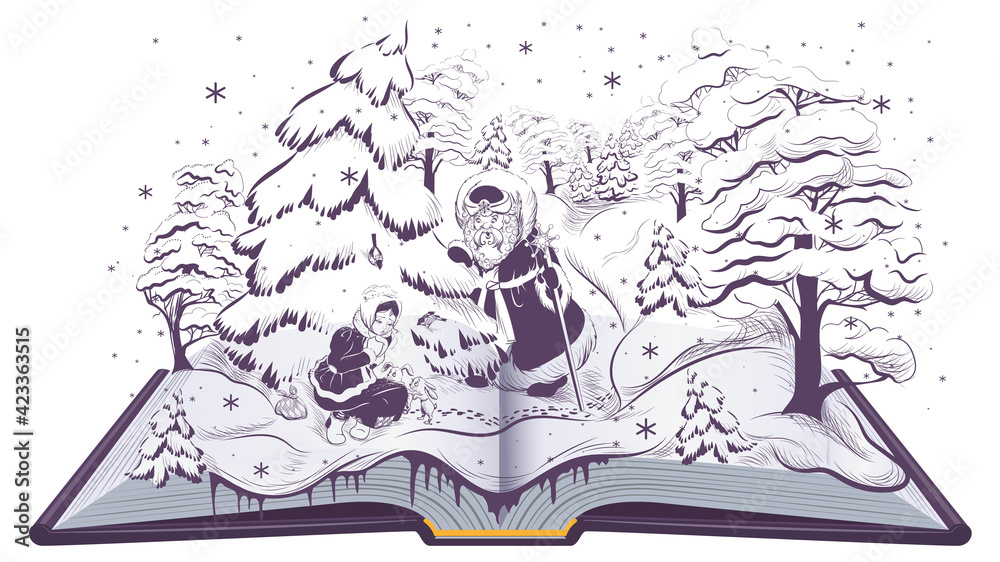 Fotografie Russian fairy tale morozko stepmother and stepdaughter girl in winter forest and santa claus