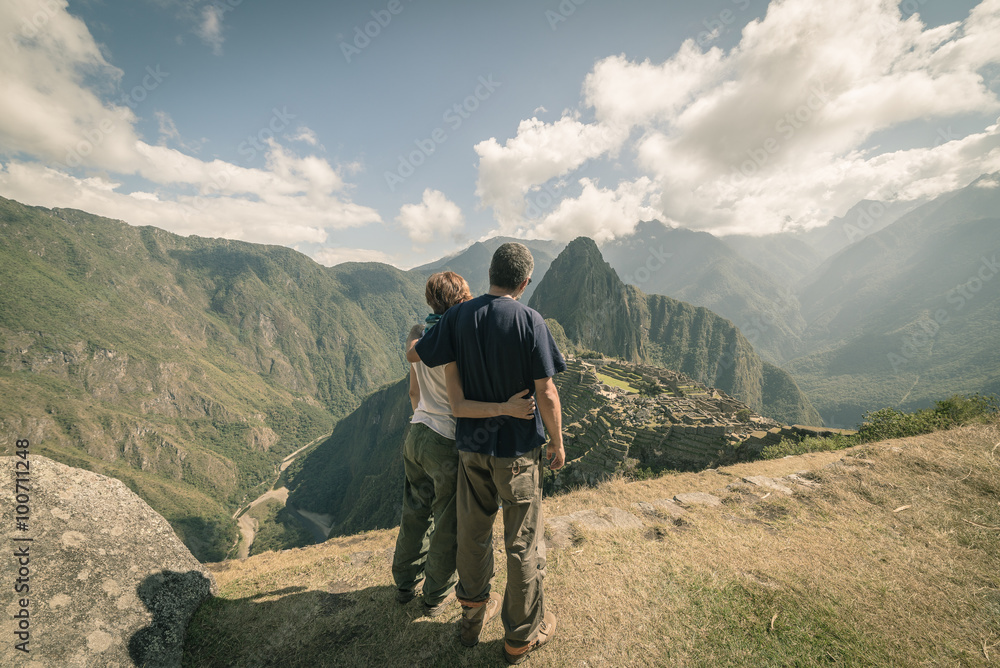 Samolepka Hugging couple looking at Machu Picchu, Peru, toned image