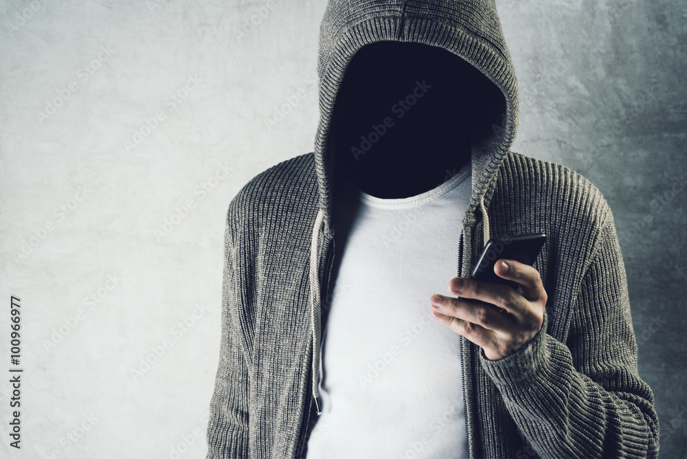 Samolepka Faceless s kapucí člověk pomocí mobilního telefonu, krádeže identity Concep