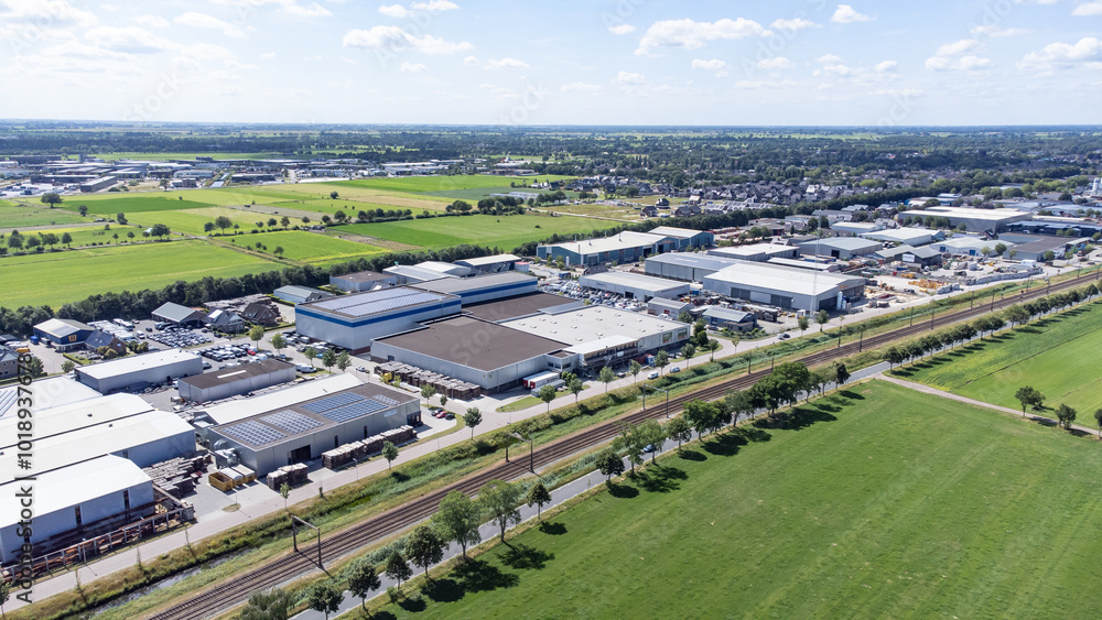 Samolepka Industrial area with company buildings from above drone view.