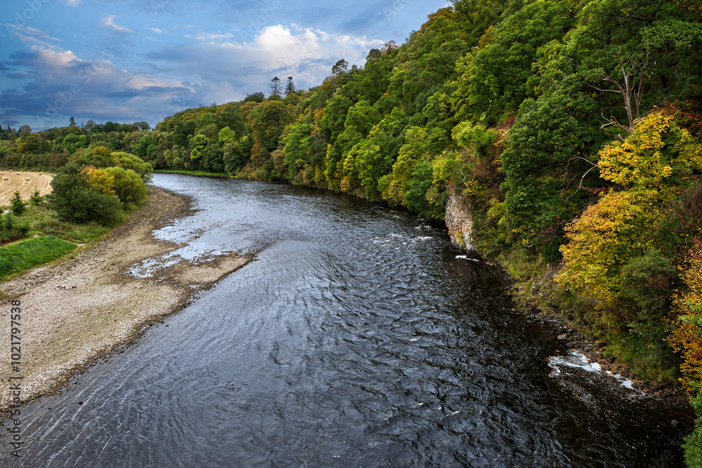 Samolepka A picturesque view of the Scottish landscape unfolds around the River Spey near Craigellachie in Moray
