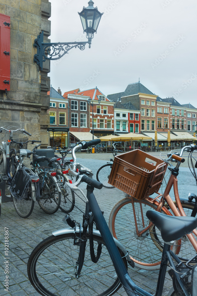 Samolepka Old town square or Dutch Markt with bicycle parking lot in Delft Netherlands