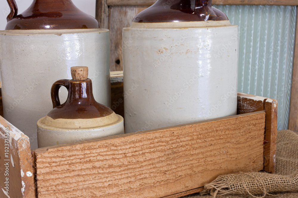 Samolepka An image of three vintage ceramic whiskey jugs in an old wooden crate and packed with burlap