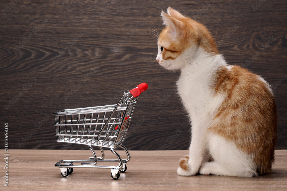 Grocery supermarket trolley and kitten. Concept - pet products, supermarket or Internet service