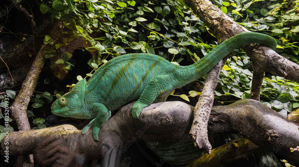 Samolepka Side portrait of a chameleon camouflages itself on a branch in the tropical habitat area of ​​the House of Sea zoo and aquarium in the center of Vienna