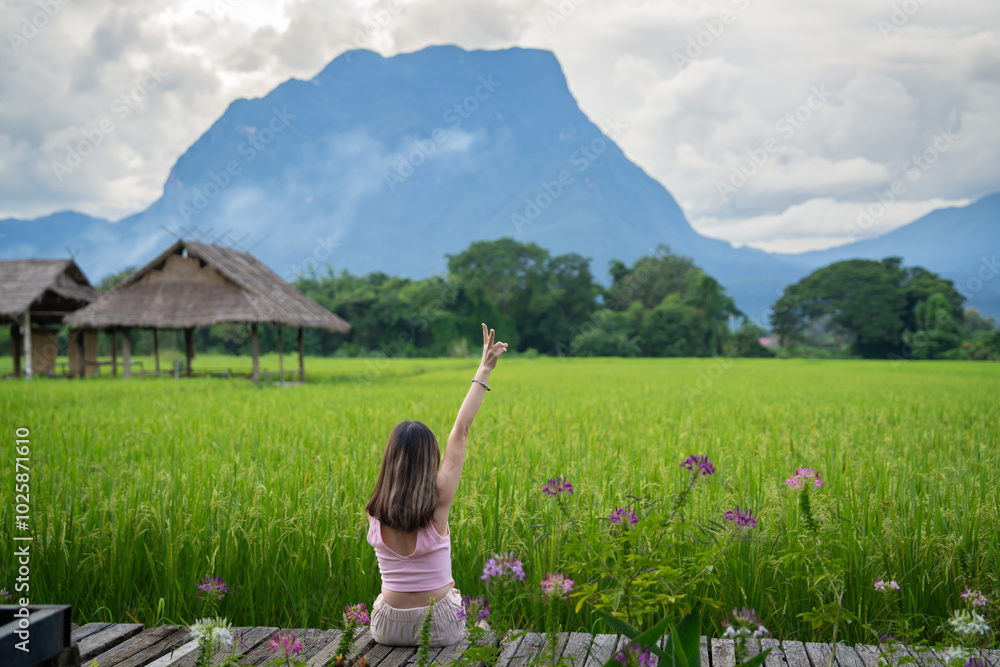 Samolepka woman sit down beside the cat and look wooden walk way bridge is in between gree