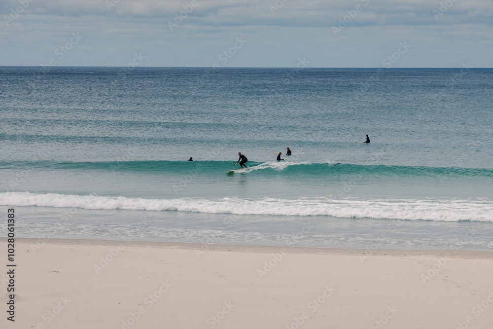 Samolepka People surfing on longboards in calm ocean waves on a sunny day at Te Arai Beach, Auckland, New Zealand