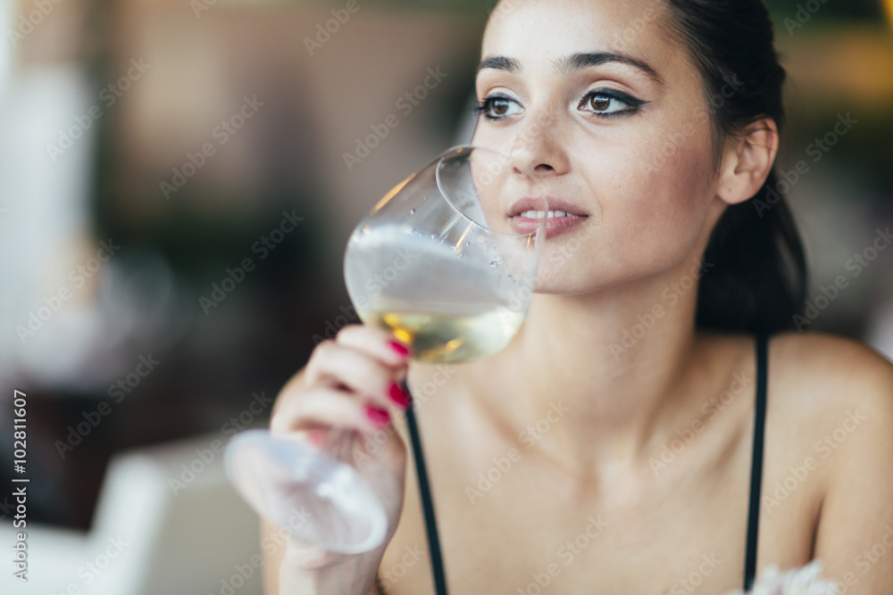 Samolepka Atraktivní žena ochutnávka bílého vína