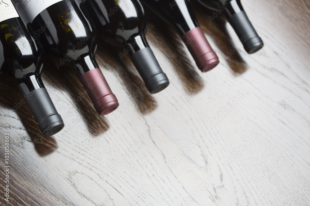 Samolepka Různé láhve vína na reflexním povrchu dřeva Abstrakt