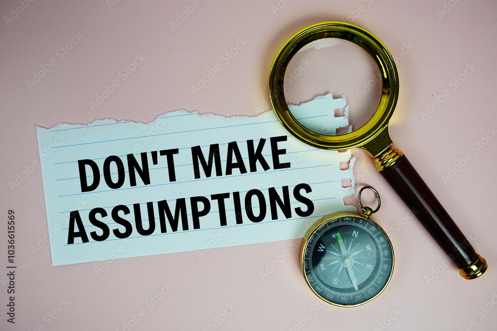 Samolepka Don't make assumptions text written on paper torn with compass and magnifying gl