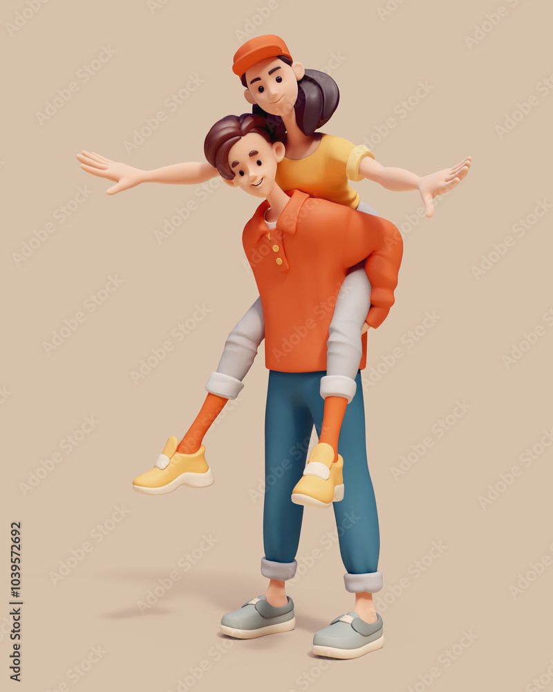 Samolepka Young excited happy asian man gives piggyback ride his cute kawaii smiling girlfriend spread hands flying fun