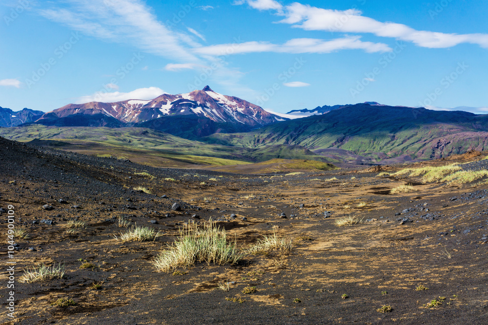 Samolepka Remote area of volcanic black sand desert wasteland with snow mountains on horizont, sharp peak of Ymir and Tindfjallajokull glacier when hiking Laugavegur trail between Emstrur Thorsmork, Iceland