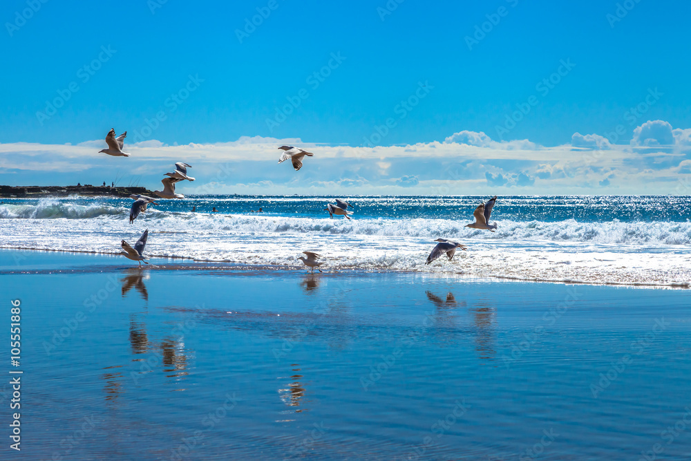 Samolepka Seagulls flying over the waves of Garie Beach in a summer sunny day, Royal National Park coastline, New South Wales, Sydney, Australia