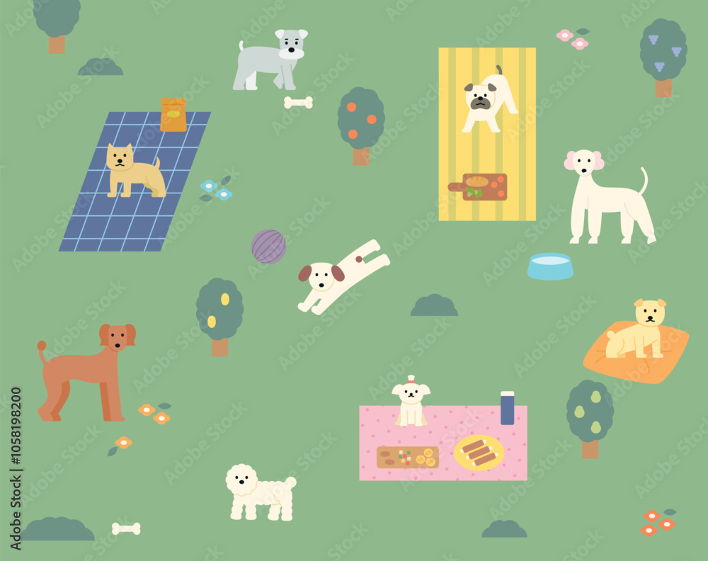 Samolepka A park for dogs. Many breeds of dogs are happily picnicking.