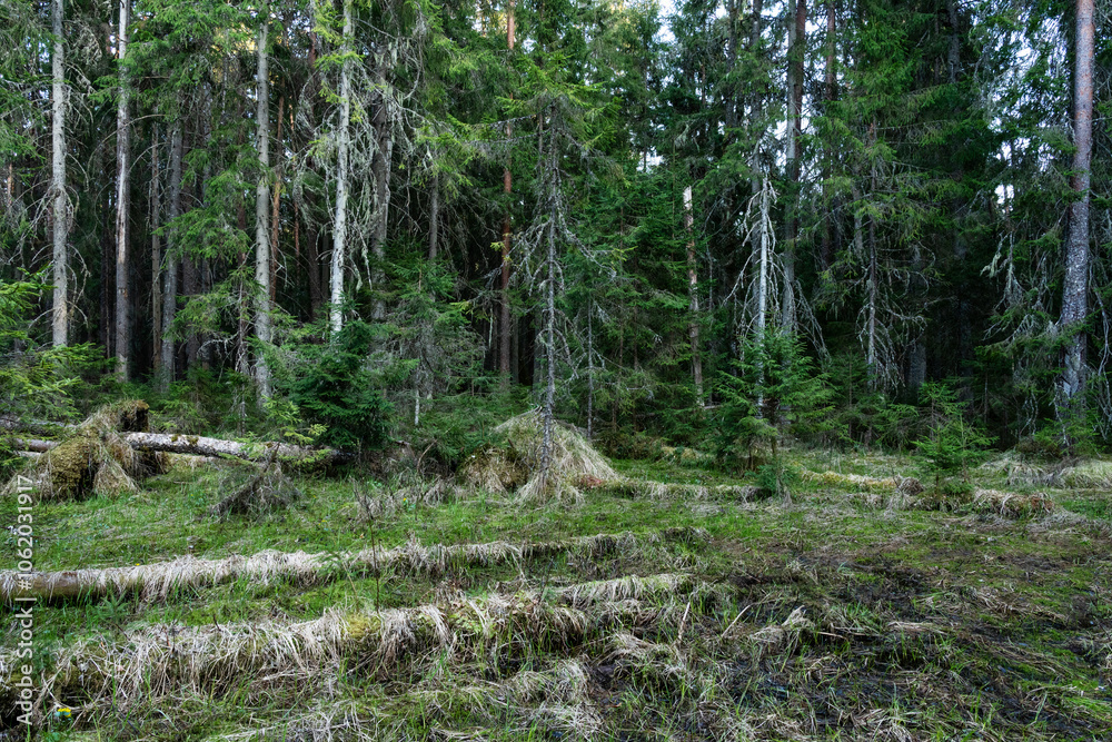 Samolepka A swampy primeval forest with lying dead wood on a spring day in Estonia, Northe