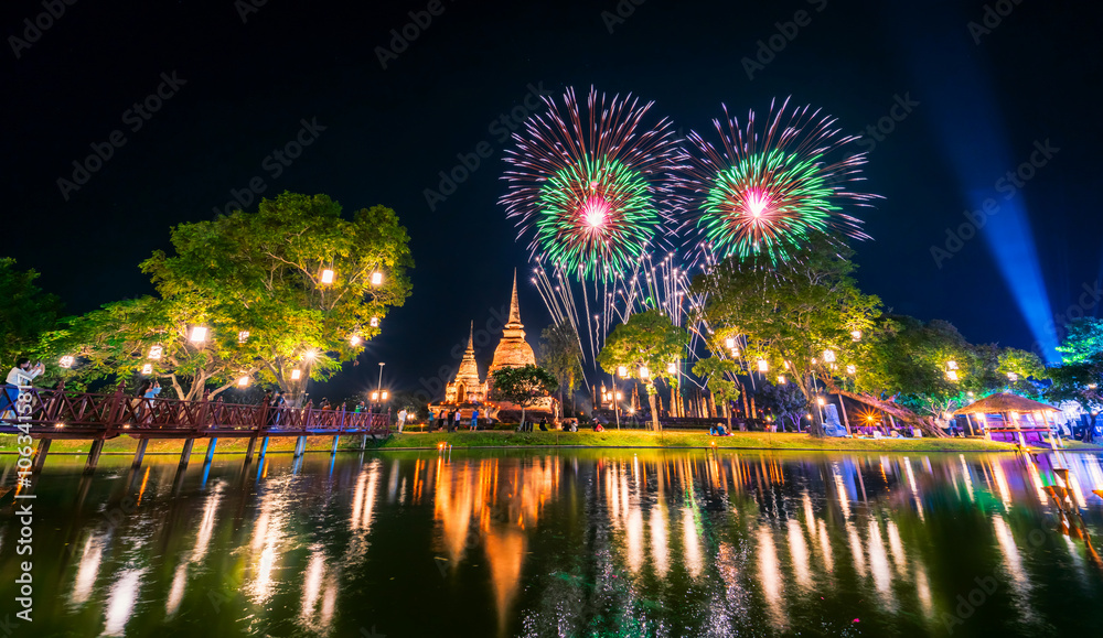 Samolepka Beautiful Firework scene light color Sukhothai Co Lamplighter Loy Krathong Festival party at The Sukhothai Historical temple park covers the ruins of Sukhothai, in what is now Northern Thailand