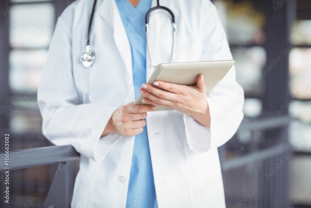 Midsection of doctor holding digital tablet