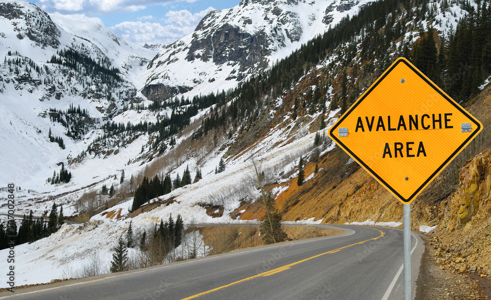 Samolepka Avalanche and Sign: A sign warns motorists in an area of southwest Colorado where an avalanche has recently covered the road