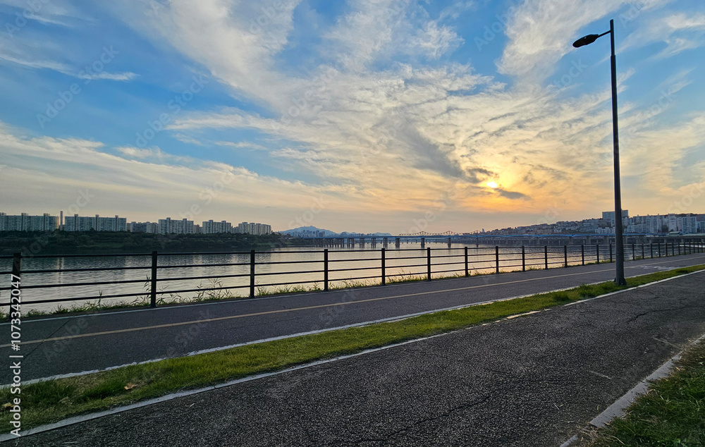 Samolepka 서울의 한강에서 노을지는 하늘과 불빛이 반짝이는 교량이 있는 도시 경관